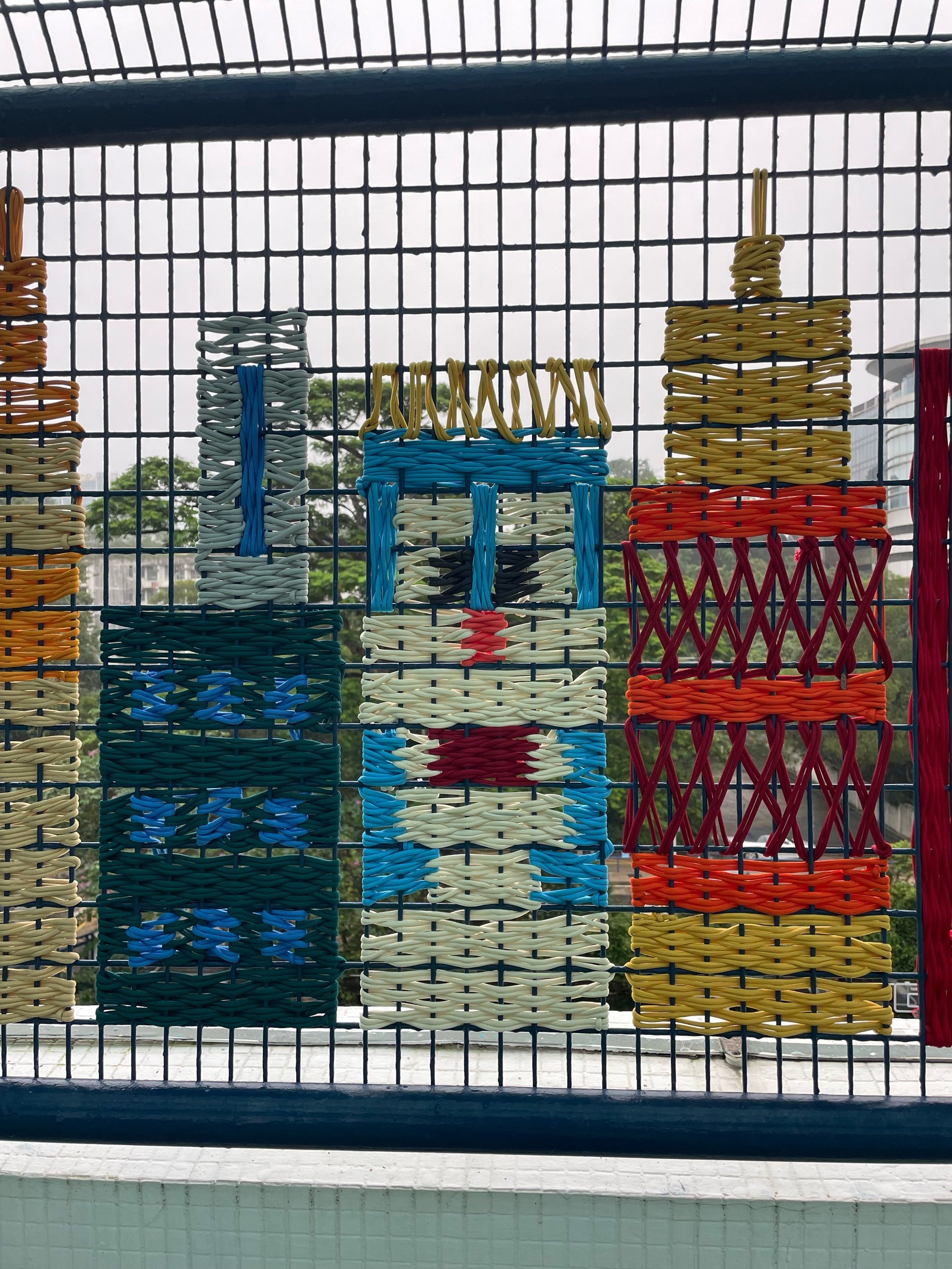 The students were first given a design brief to come up with building designs inspired by the Hong Kong skyline and provided with the fence dimensions so they could create their design within the parameters of the project. I also provided the students with an example of some skyline buildings taking inspiration from iconic Hong Kong structures, which they were encouraged to incorporate into their individual contributions. After selecting a vibrant color palette of poly cords, we set to work on building our imaginary skyline.